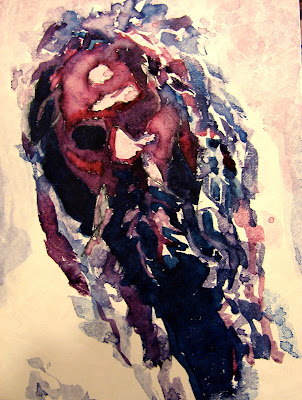 I thought I would get some version of purple but Cobalt and Indian Red make an umber color when mixed. My photo "dude" has dreadlocks so I am experimenting trying different ideas to depict this look. Very tricky, indeed. I also floated some white into this image. Overall, I think it is a tad overworked but a color combination I would use again.