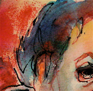While I was visiting my sister in Israel in September, I came across an old watercolor magazine printed in England. There was a woman featured in the magazine who just grabbed my attention. When I got home, I "Googled" her. What did we do before the internet? Her name is Shirley Trevena - and Amazon has a book by her called "Taking Risks with Watercolour" published by Collins. It was waiting for me when I got home! I absolutely love this woman's work. I read it in bed in two nights. Today, I decided to try some of her techniques on a practice sheet. I was trying everything I could think of so, naturally, things got out of hand. It didn't matter, because I was just testing and messing. She is into lines, texture, COLOR, value and composition. Everyone is turned on by different elements and different artists, but for me Shirley has the incredible blend of abstraction and realism that I am working towards. It is interesting challenge to translate what she does with flowers and still lifes into figures and faces . Anyway, I had a lot of fun playing around. I am posting a detail of a great technique described in the book. I have never come across this idea before, so I wanted to share. Using a piece of coarse sandpaper, hold it over a wet wash (or wet a section of the watercolor paper). Rub a watercolor pencil on the sandpaper and the granules will fall into the wet area and not stick to the dry paper. It makes a great texture and creates a nicely sharpened pencil as well!