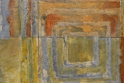 This detail shows the fiber paste through a metal labyrinth stencil. I also used a few of the Derwent Graphite colored watercolor pencils to enhance some of the shapes.